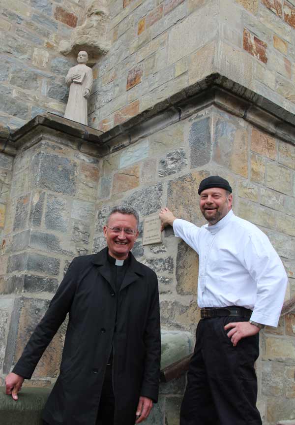 Als Geschenk hatten die Gemeinden die Statue von Abbé Franz Stock mitgebracht – wenngleich die Gläubigen die rund 150 Kilogramm schwere Steinskulptur nicht per eigener Muskelkraft zum Dom transportiert hatten. Doch wurde die Figur, die die Innenstadtgemeinden dem Hohen Dom zum Weihejubiläum seines Vorgängerbaus schenkten, während der Sternwallfahrt gesegnet. Eingesetzt schon am Freitag steht sie nun in einer von bisher zwei unbesetzten Figurennischen am Aufgang zur Sakristei. Daneben prangt eine Plakette, die für die Nachwelt festhält, dass die Statue ein Geschenk der Paderborner Gemeinden ist.