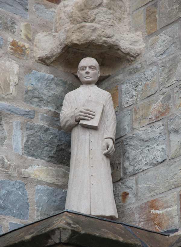 Die neue Skulptur von Abbé Franz Stock steht in einer von bisher zwei unbesetzten Figurennischen am Aufgang zur Sakristei.