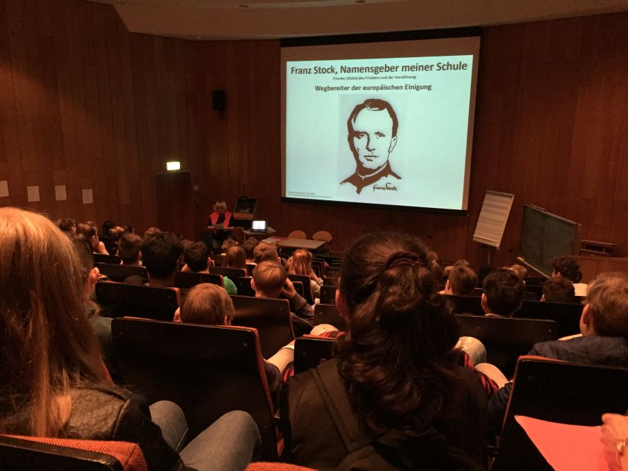 Die Jahrgangsstufen 7 und 8 haben sich am Montag, 9. Juli und am Dienstag 10. Juli jeweils einen ganzen Vormittag mit Franz Stock beschäftigt. Margreth Dennemark vom Franz-Stock-Komitee hielt an beiden Tagen einen Power-Point-Vortrag mit dem Thema: "Franz Stock - Namensgeber meiner Schule". Danach begannen die Projektarbeiten in mehreren Gruppen mit unterschiedlichen Aufgabenstellungen: "Franz Stock und sein Leben", "Was denken SchülerInnen über die deutsch-französische Freundschaft" "Was denken SchülerInnen über den Namensgeber ihrer Schule" und "Wie wird Europa in 20 Jahren aussehen? Was wünschen sich SchülerInnen für ihre eigene Zukunft von Europa?".