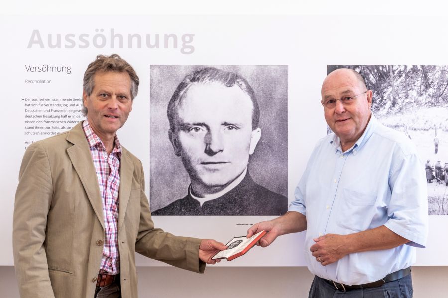 Übergabe an Dr. Jürgen Schulte-Hobein (l.) durch Thomas Bertram Bei der Neugestaltung der Dauerausstellung des Sauerland-Museums in Arnsberg wird in einem Raum an die Person und das Wirken von Franz Stock unter dem Leitbegriff „Versöhnung“ gedacht. Aus diesem Grund wurde das Komitee um einen geeigneten Gegenstand gebeten. Da weder aus privatem Besitz noch aus den dem Komitee zur Verfügung stehenden Dokumenten etwas Passendes zur Verfügung stand, gelang es, durch Vermittlung unserer Schwesterorganisation Les Amis de Franz Stock (Frankreich) den Nachlass von Karl Viktor Gilles dem Sauerland-Museum zu übereignen.