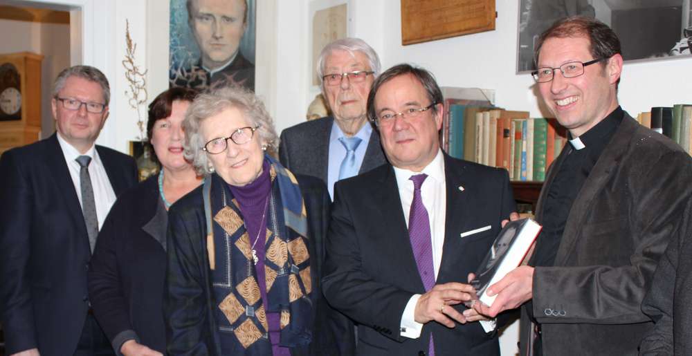 Ministerpräsident Armin Laschet besuchte am Freitag, 19. Januar die Gedenk- und Begegnungsstätte im Elternhaus Franz Stock. Neben dem Vorsitzenden des Komitees, Pfarrer Stephan Jung, wurde er von den Zeitzeugen Theresia Stock (jüngste Schwester Stocks) und Dieter Lanz (einst Seminarist im Stacheldrahtseminar von Chartres) begrüßt.