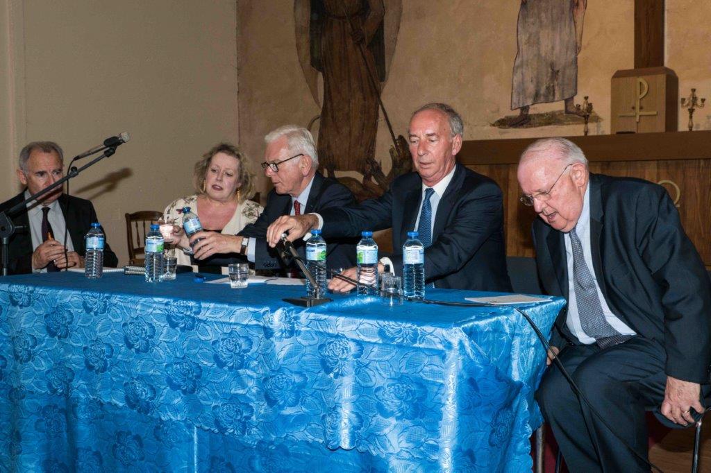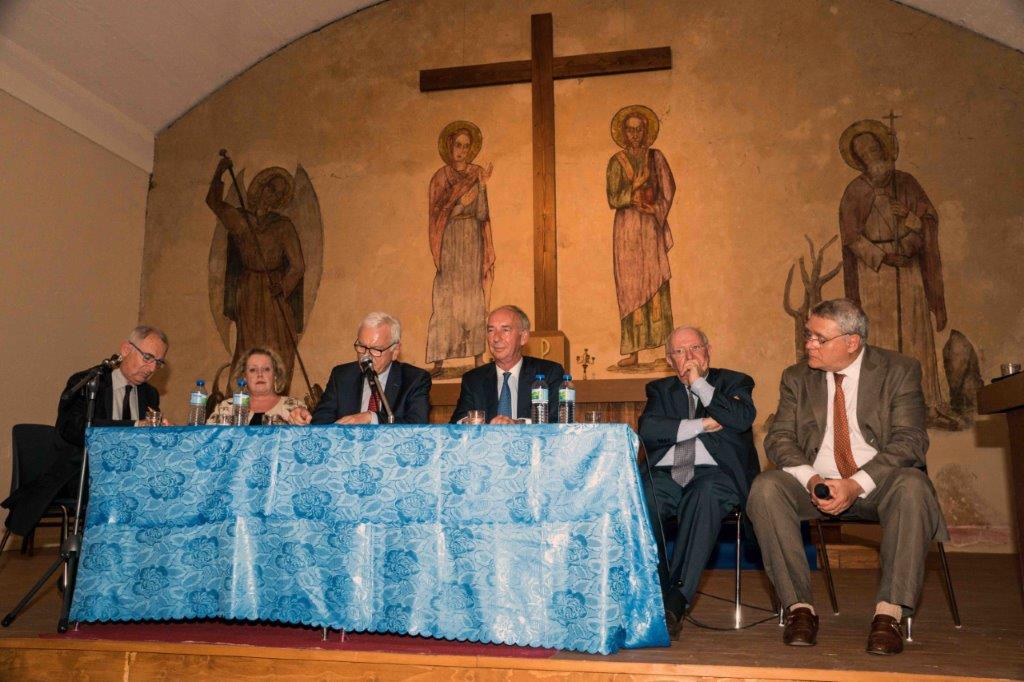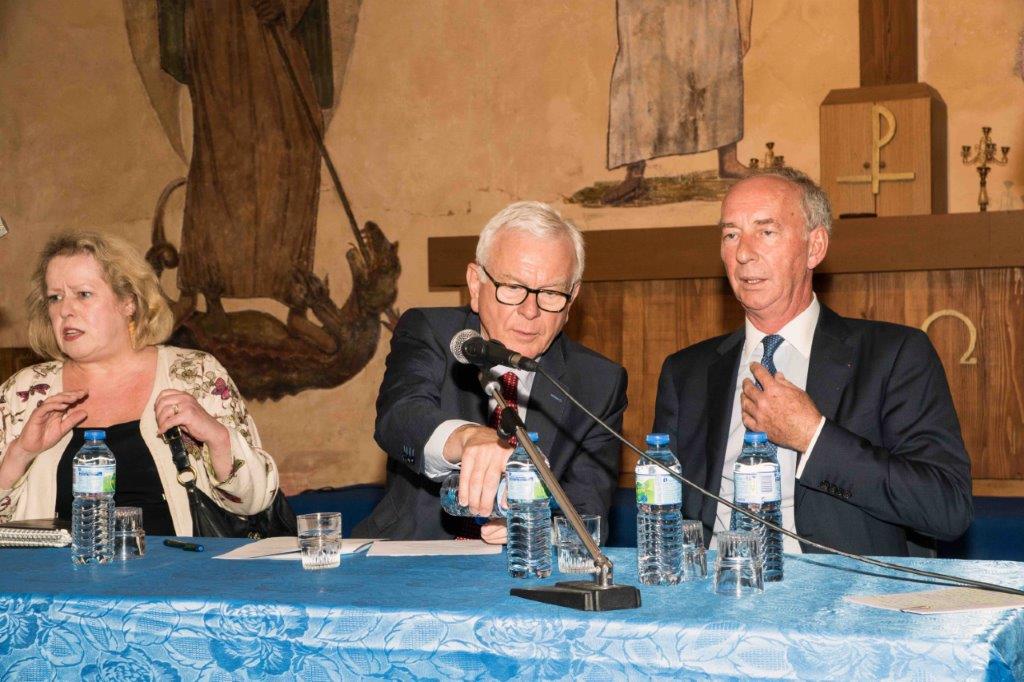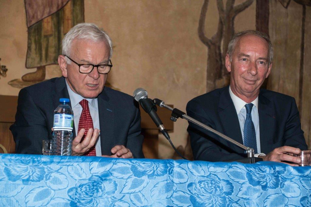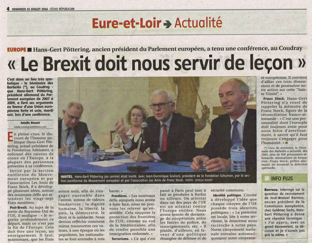 Invités en commun par la section d’Eure-et-Loir du Mouvement Européen – France et « Les Amis de Franz Stock » Hans-Gert Pöttering, Président de la Fondation Konrad Adenauer, ancien président du Parlement européen et Jean-Dominique Giuliani, Président de la Fondation Robert Schuman, ont débattu sur « les nouveaux défis européens » le 12 juillet 2016 au Séminaire des Barbelés.