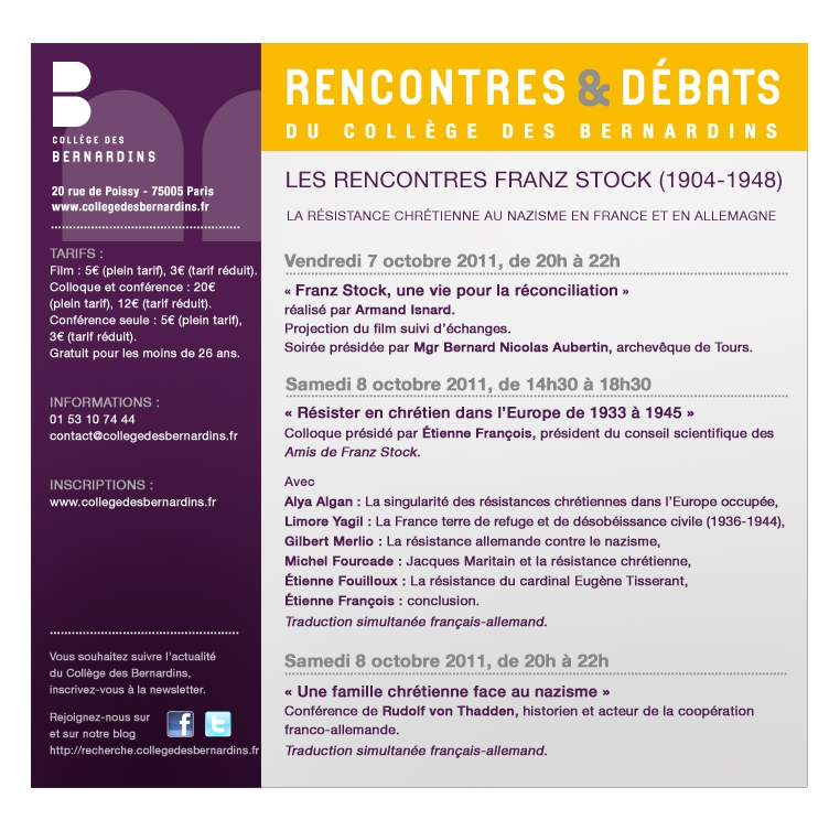 Bild Franz StockDie Les Amis de Franz Stock (Frankreich) laden am 7. und 8. Oktober 2011 zu einem Kolloquium und Vortrag unter dem Titel “Widerstand der Christen gegen den Nationalsozialismus in Frankreich und Deutschland” in das Collège des Bernardins, Paris ein.